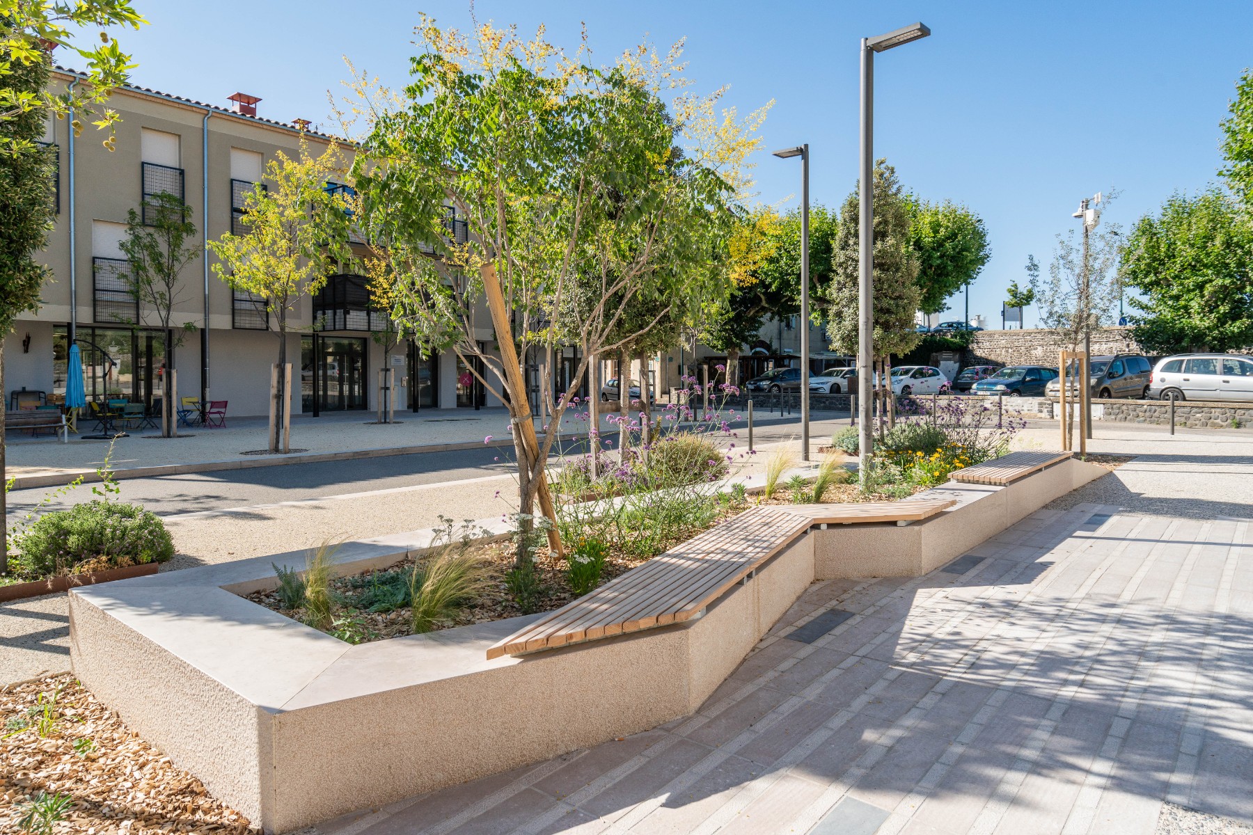 Une trame organisée sur l’orientation de la façade de la Mairie structure l’ensemble du projet paysager. Cette trame est traduite par un jeu de matérialité qui se compose de grandes dalles en béton, de pavés de divers jointements et de massifs plantés. Guidé par la volonté d’avoir un aménagement intégré au tissu urbain, le projet se pare d’une esthétique sobre, rurale et contemporaine. Ainsi des lignes de pavés jalonnent le projet et les dalles de béton, jointes par des linéaires tantôt minéral, tantôt végétal. Cet aménagement propose de prolonger la Halle à ciel ouvert afin d’offrir un espace de convivialité, de partage et de rencontre. Ainsi, deux massifs plantés encadrent un espace de circulation libre jalonnés d’assises où de grandes lignes de pavés accompagnent les usagers. Au centre de l’aménagement, le monument aux morts se tient au sein de ce lieu de rencontre afin de s’intégrer à la vie quotidienne des passants.