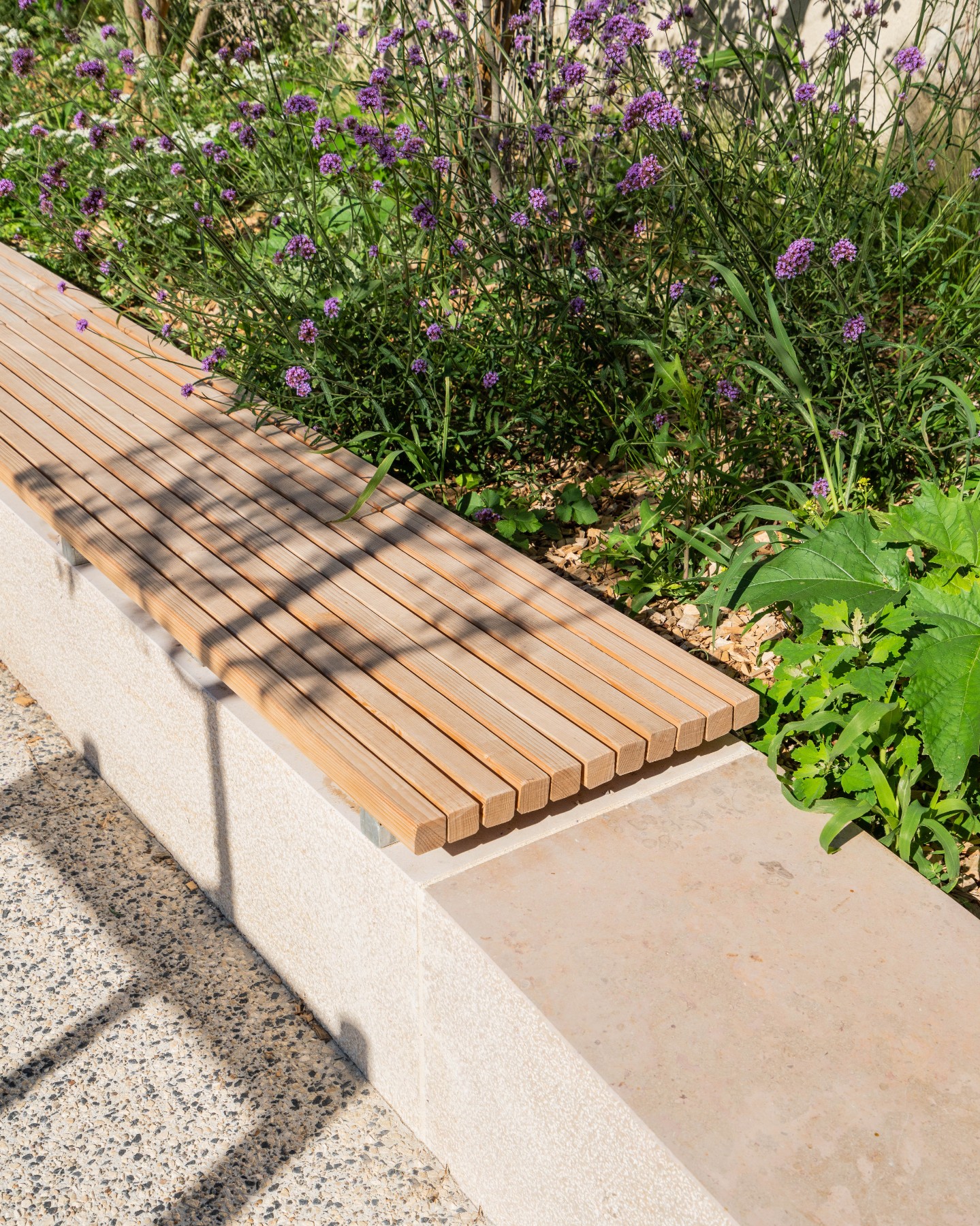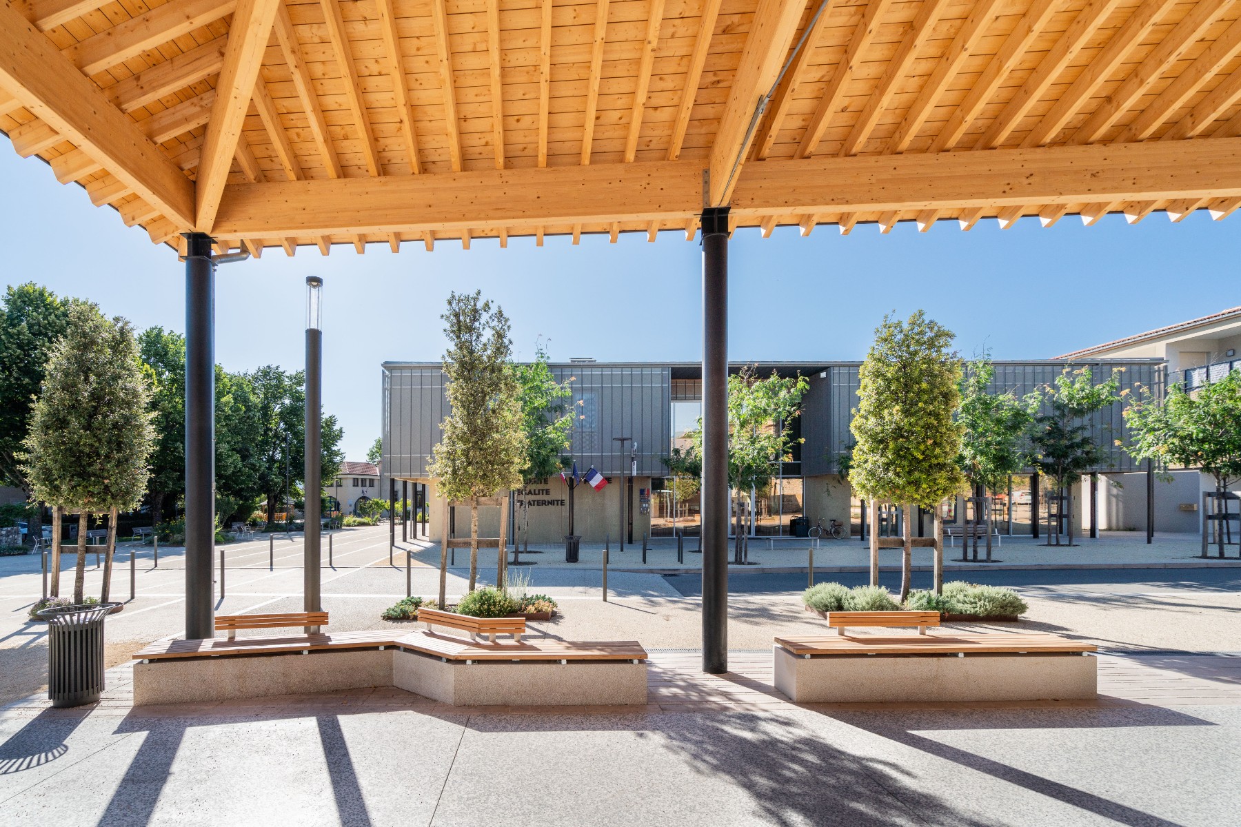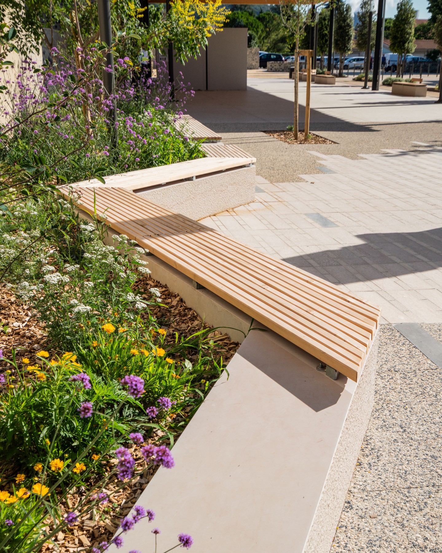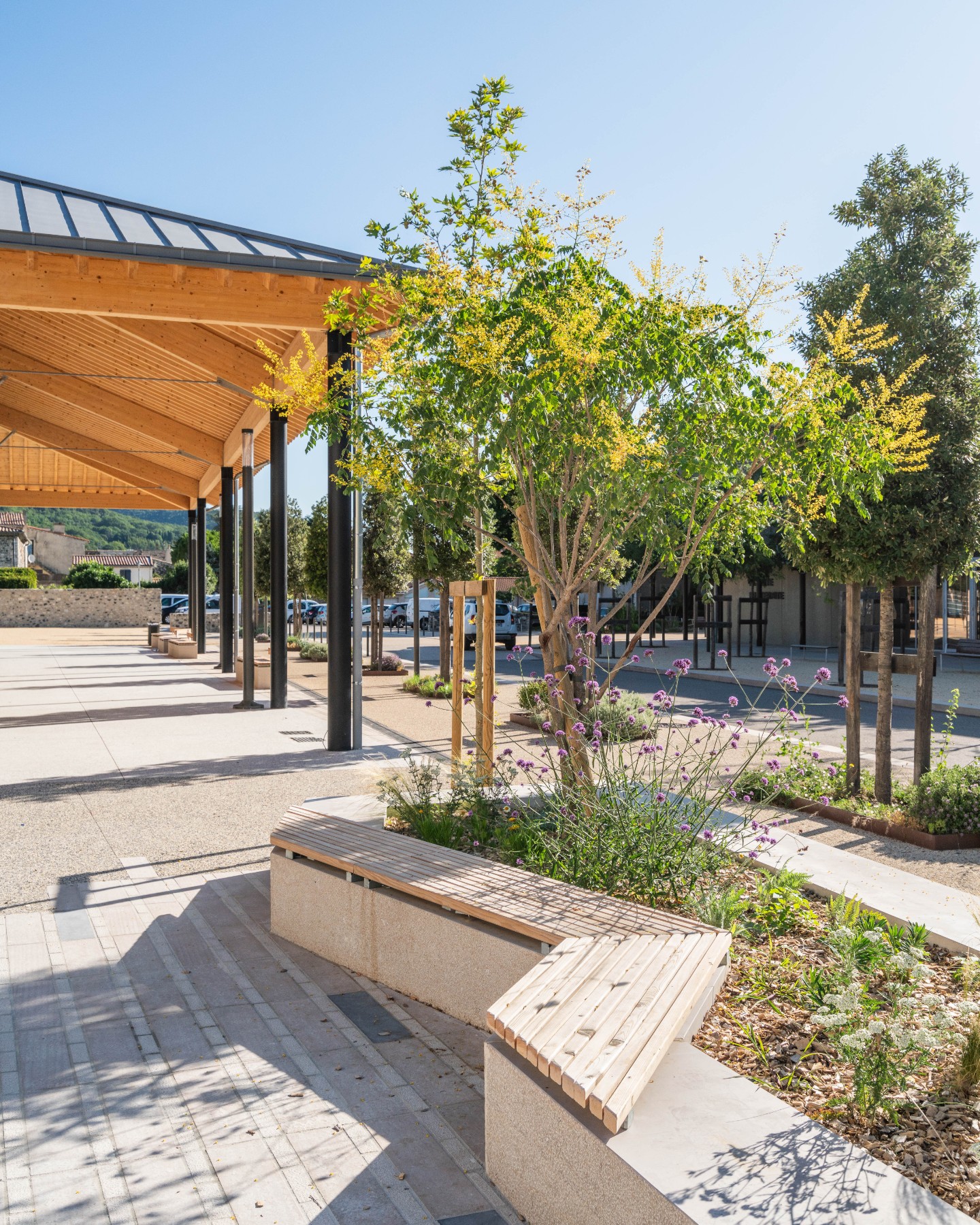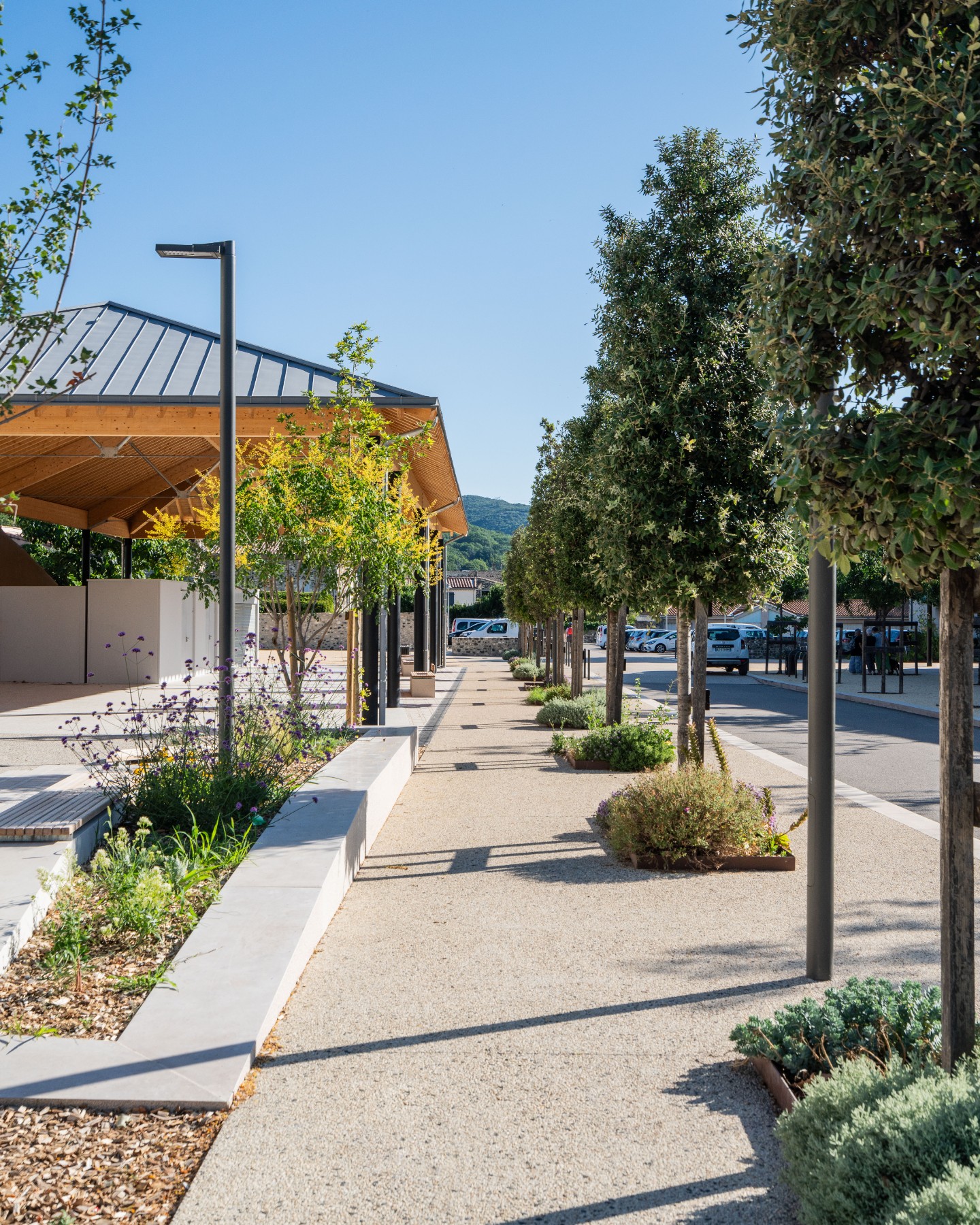 Une trame organisée sur l’orientation de la façade de la Mairie structure l’ensemble du projet paysager. Cette trame est traduite par un jeu de matérialité qui se compose de grandes dalles en béton, de pavés de divers jointements et de massifs plantés. Guidé par la volonté d’avoir un aménagement intégré au tissu urbain, le projet se pare d’une esthétique sobre, rurale et contemporaine. Ainsi des lignes de pavés jalonnent le projet et les dalles de béton, jointes par des linéaires tantôt minéral, tantôt végétal. Cet aménagement propose de prolonger la Halle à ciel ouvert afin d’offrir un espace de convivialité, de partage et de rencontre. Ainsi, deux massifs plantés encadrent un espace de circulation libre jalonnés d’assises où de grandes lignes de pavés accompagnent les usagers. Au centre de l’aménagement, le monument aux morts se tient au sein de ce lieu de rencontre afin de s’intégrer à la vie quotidienne des passants.