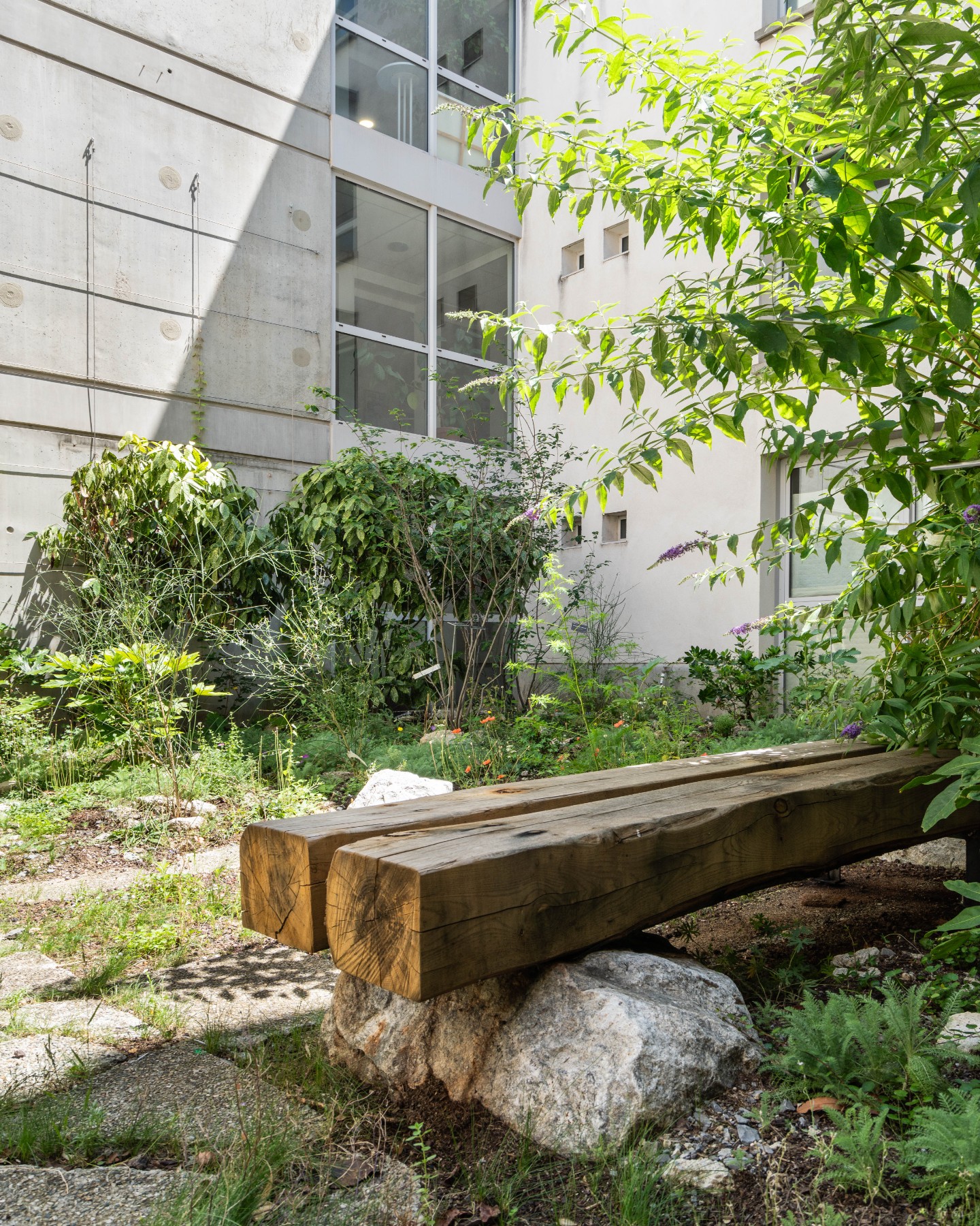 Détail de projet, les bancs en bois et pierre (granit) ©Ludovic Maillard